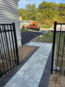 Connecting the front yard to the rear outdoor space required a durable and safe pathway. We designed and installed a custom interlocking paver walkway that guides visitors along the side of the house.